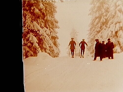 Vintermotiv. Fem personer, två av dem åker skidor.