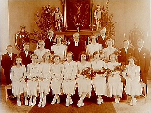 Konfirmander. 13 flickor, 6 pojkar och en präst.