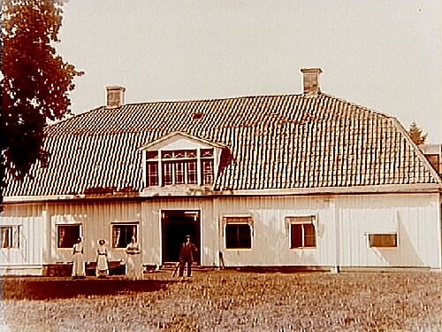 En och en halvvånings flygelbyggnad med frontespis, 4 personer framför huset.