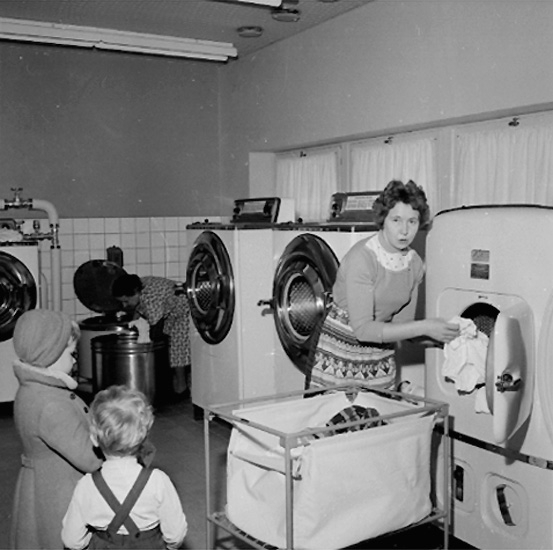 Konsum tvätt, interiör, fyra personer.