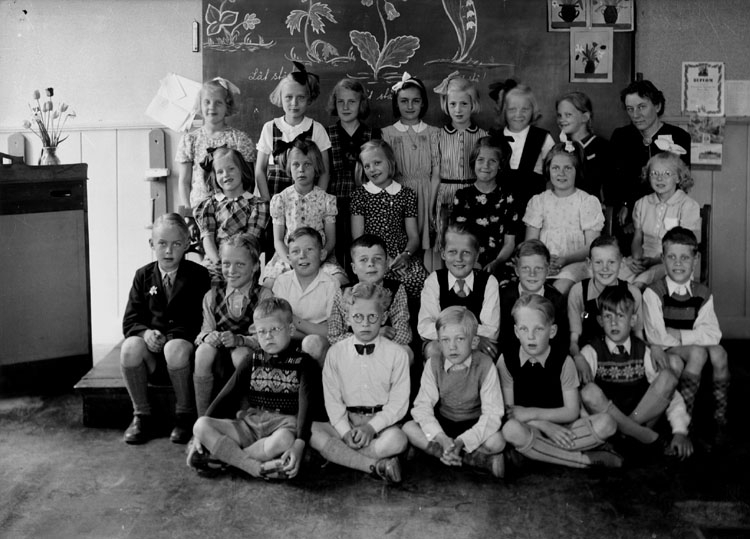 Klassrumsinteriör, 26 skolbarn med lärarinna.