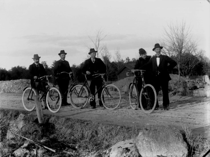 Fyra män med cyklar och en kvinna.