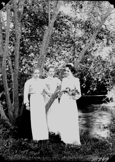 Tre kvinnor i parken, vid vattnet.