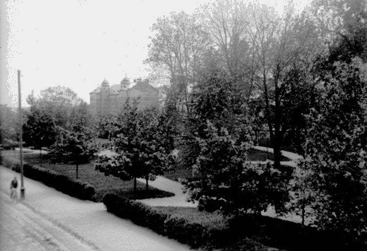 Oskarsparken från Trädgårdsgatan sett. I bakgrunden syns Risbergska skolan.