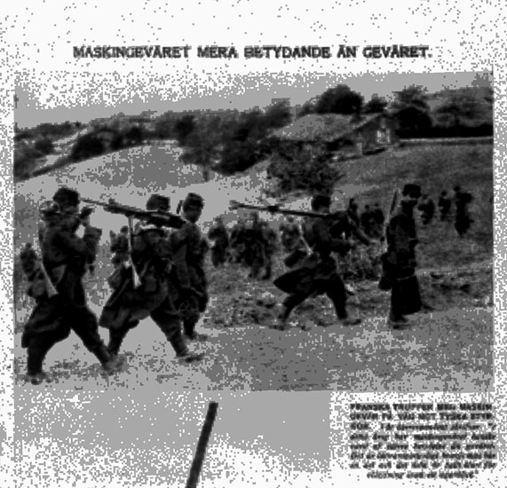 Krigföring, franska trupper med maskingevär på väg mot tyska styrkor.