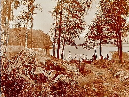 Roddbåt med 5 personer vid stranden.