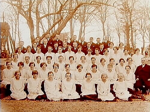 Konfirmander, 44 flickor, 17 pojkar och prästen.