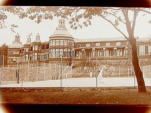 Styrsö badrestaurang med nya tennisbanan i förgrunden.