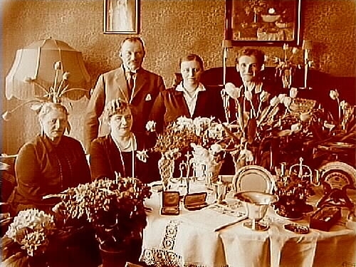 Rumsinteriör, familjegrupp fem personer vid bordet.
