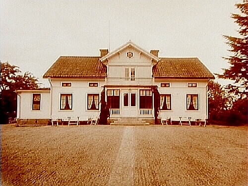En och en halvvånings bostadshus med frontespis och glasad veranda.