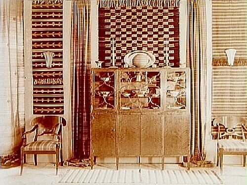 Örebro Läns Hemslöjdsaffär, affärsinteriör, mattor, 2 stolar, glasskåp med skålar.