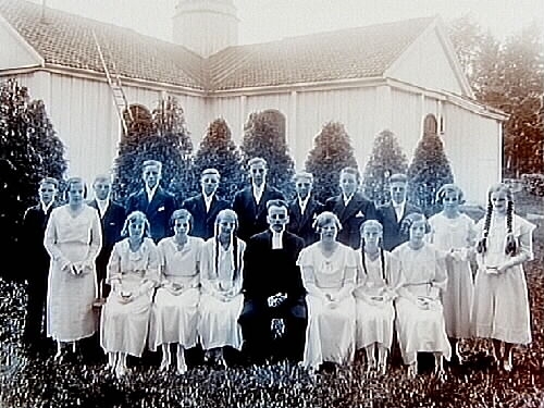 Konfirmander, 9 flickor, 8 pojkar och pastor Svensson.
