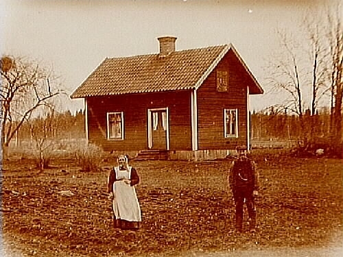 Envånings stuga, äldre par framför stugan.