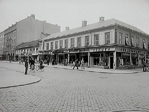 Tvåvånings bostadshus med ett antal olika affärer och konditori, café m m.