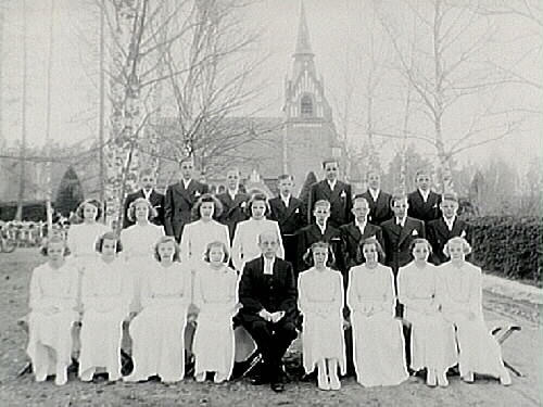 Konfirmander, 12 flickor, 11 pojkar och pastor Gunther.