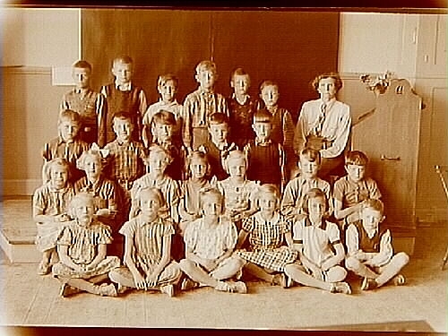 Holmens skola, klassrumsinteriör, 24 skolbarn med lärarinna fröken Lilly Ahnmark, sal 10.