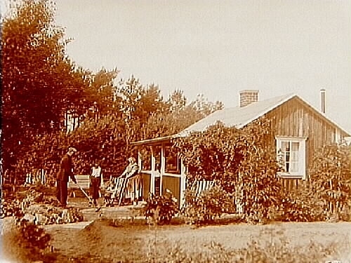 Sommarstuga med veranda, familj 4 personer vid stugan.