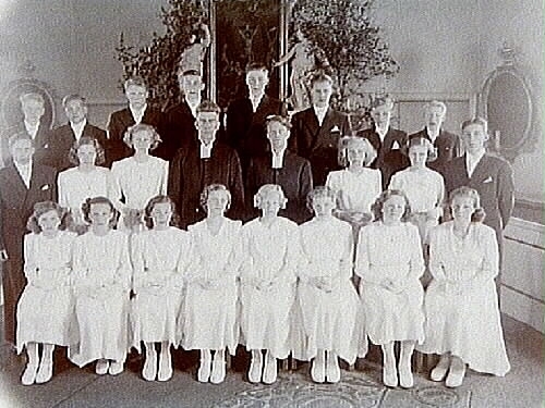 Tolv flickor, tio pojkar och pastor Hilding Hasselmyr och pastor Lagerstedt (O.P. kyrkan).