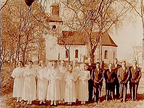 Konfirmander, 8 flickor, 5 pojkar och prosten Areborg.