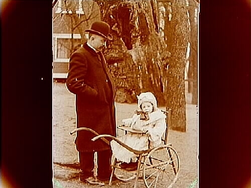 En man med ett barn i kärran på Stora Holmen.