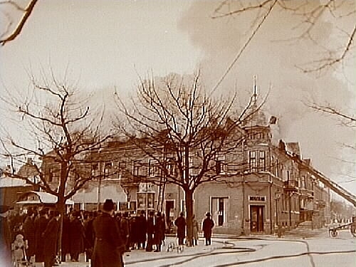 Tvåvånings bostadshus som brinner, brandkåren är där och släcker.