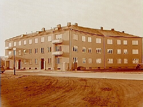 Trevånings bostadshus med balkonger.