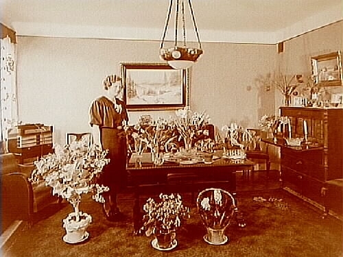 Titel: Rumsinteriör, en kvinna. Köpman Axel Erikssons fru på 40 årsdagen.