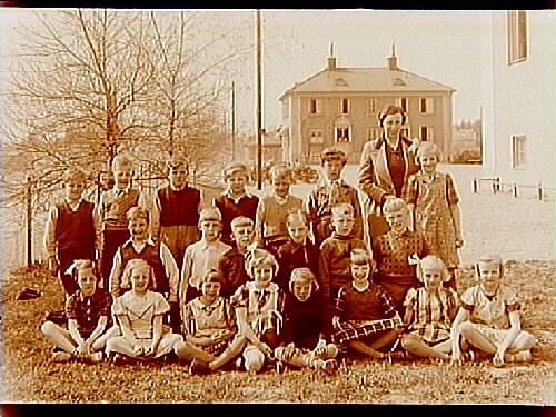 Holmens skola, 9 flickor och 12 pojkar med lärarinnan fru Lilly Lund på skolgården. Klass 2, sal 10.