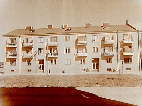 Trevånings hyreshus med balkonger.