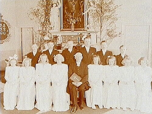 14 konfirmander, 8 flickor, 6 pojkar och pastor Thorman.
