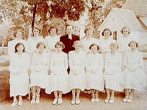 13 konfirmander, 13 flickor med pastor Martin Hedberg.