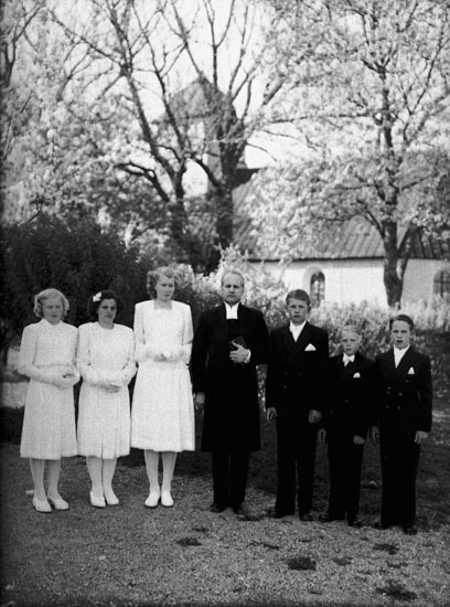6 konfirmander, 3 flickor, 3 pojkar och en präst.