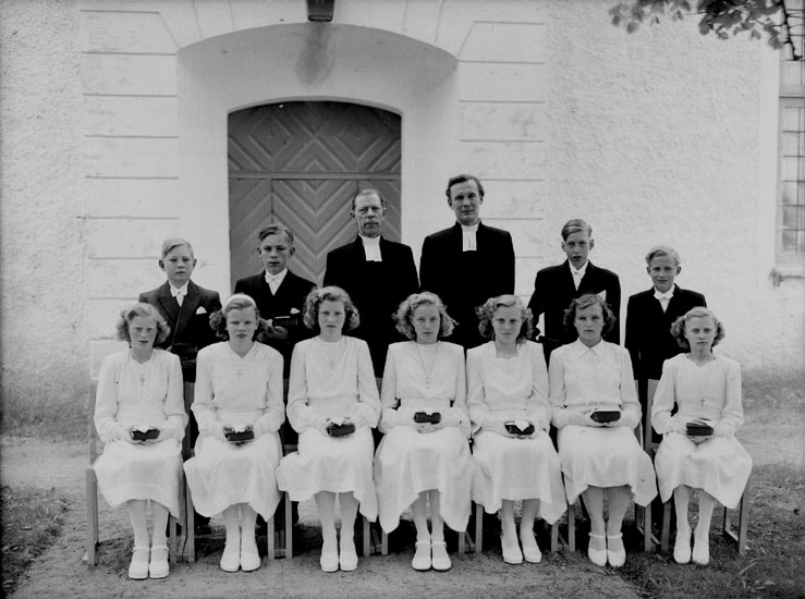 11 konfirmander, 7 flickor, 4 pojkar och två präster.