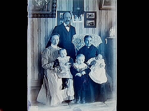 Rumsinteriör, grupp sex personer: en man, två kvinnor och tre barn.