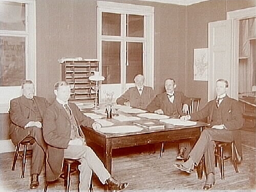 Kontorsinteriör, 5 män kring ett bord.
