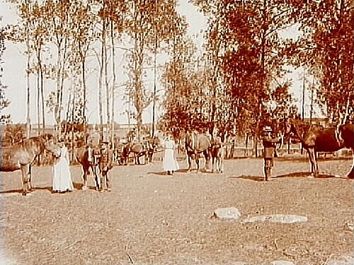 5 hästar och 2 föll på ängen, 4 personer håller i hästarna.