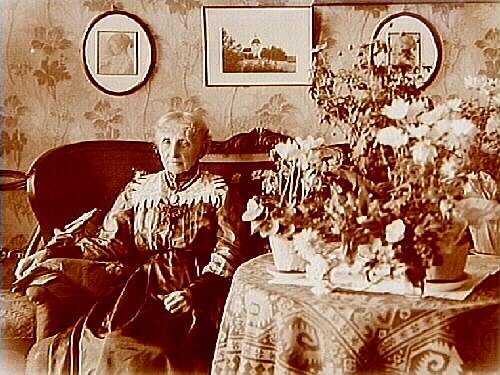 Titel: Rumsinteriör, en äldre dam i salongssoffan. Fröken Årman