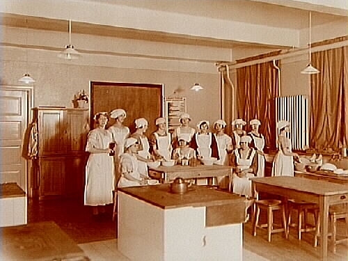 Almby skola, interiör av skolköket, 12 flickor och fröken Hardner.