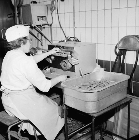 Konsum, charkuteriavdelningen, interiör, korvtillverkning, en kvinna.