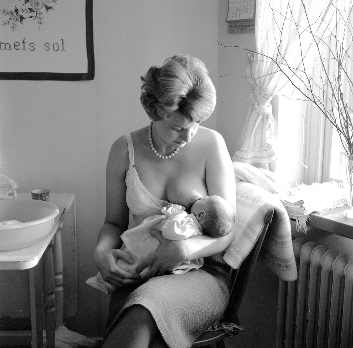 Titel: Rumsinteriör, en kvinna och en baby, amning. Plutt och Patrik.