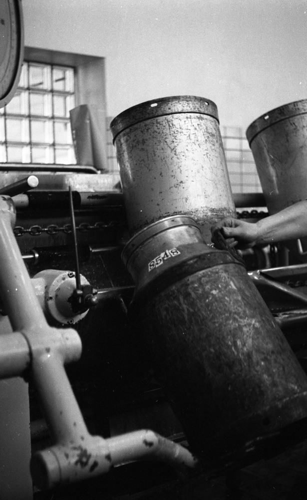 En mjölkkanna av metall inne i en fabriksbyggnad i en livsmedelsindustri. En maskin syns även på bilden.