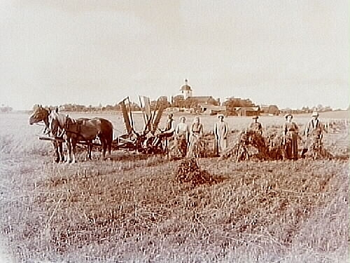 Skördebild. Slåttermaskin med två hästar, sex personer som binder kärvar.