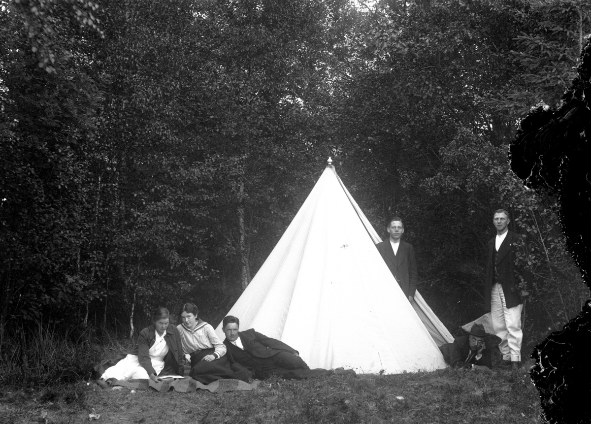 Gruppbild, sex personer vid en tält.