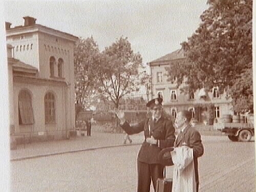 Rune Åhrling med maratonlöpare Sven Håkansson vid Örebro Centralstation. Sven var på väg till Londonolympiaden.