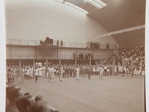 Invigning av Örebro Idrottshus 1 sept. 1946. Uppställning för invigning.