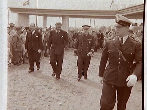 Örebroutställningen, Idrottshuset 1947. Advokat Claes Ljung, prins Bertil och landshövding Bror Hasselroth.