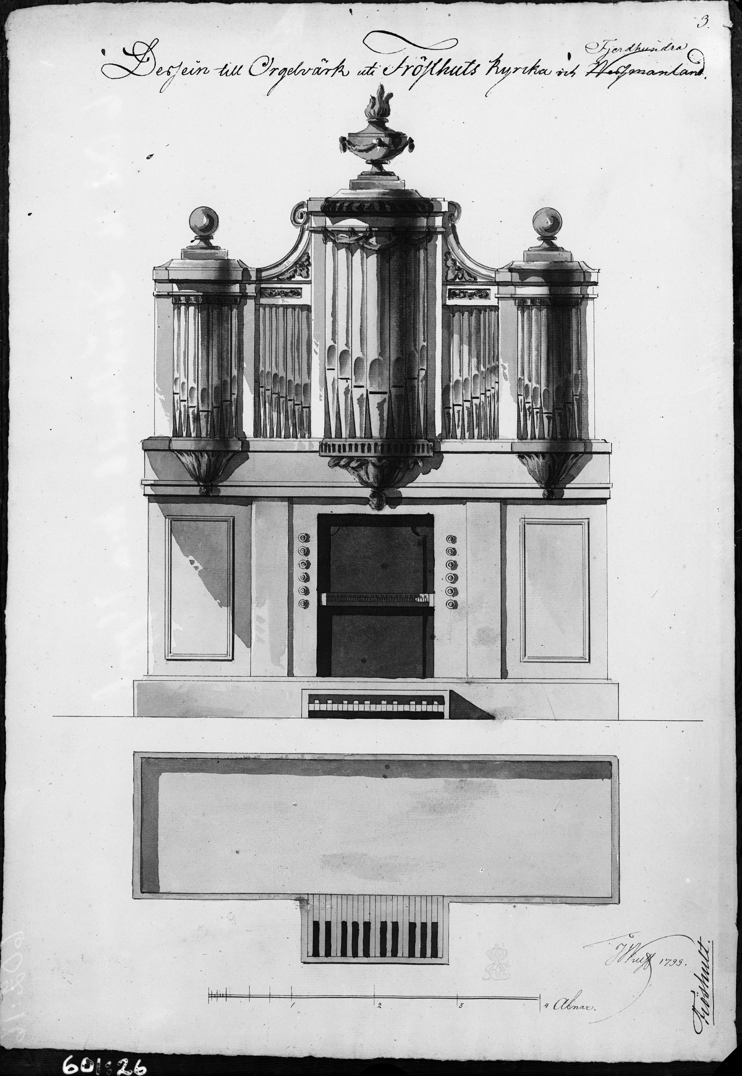 Orgeln, ritning från 1799, i Kungliga Byggnadsstyrelsens arkiv.