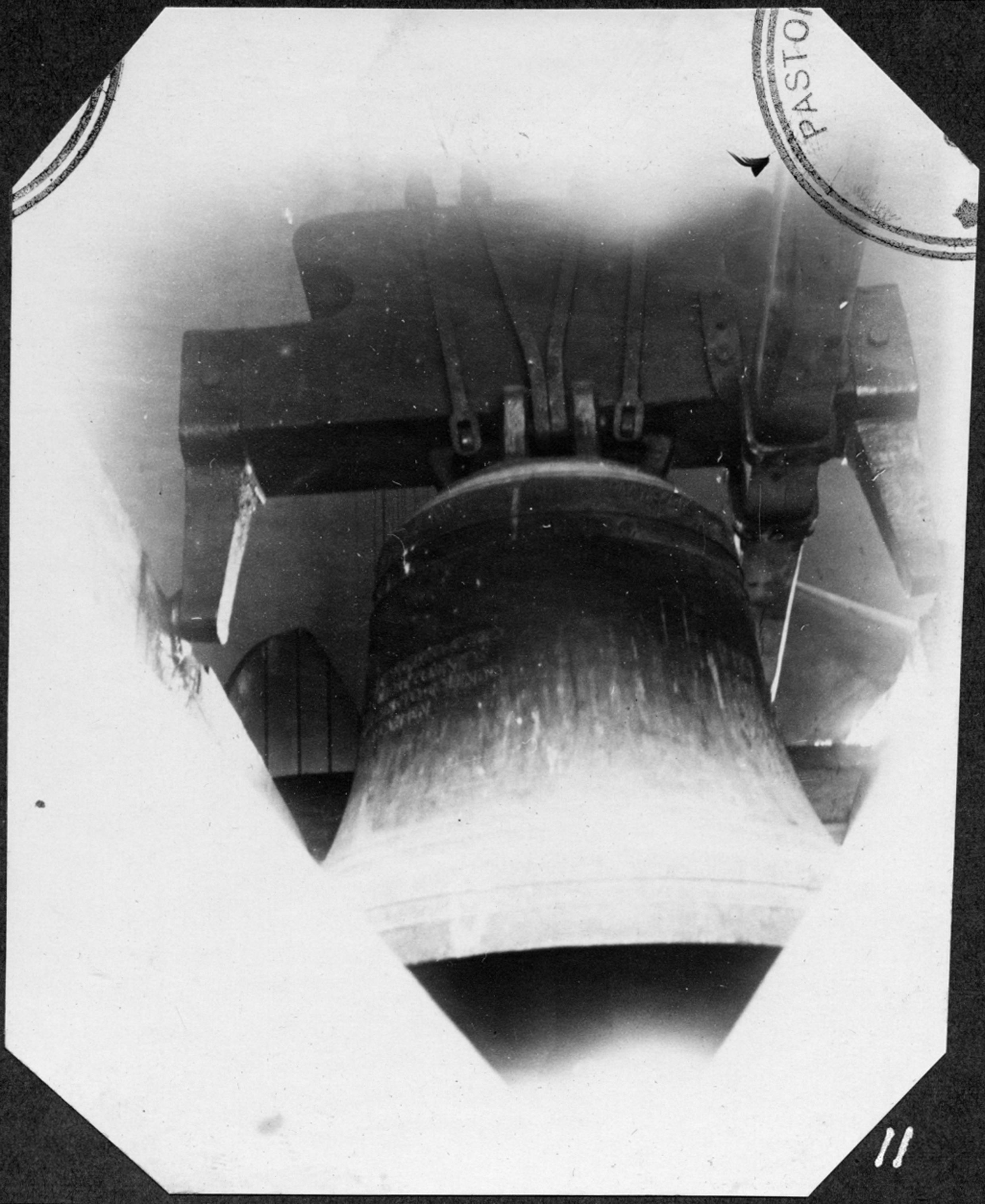 Kyrklocka av malm, har tillhört den gamla kyrkan, omgjuten 1925.