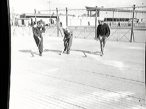 Bandyträning på Eyravallens dansbana vid ÖSK:s tivoli. Erik Svensson, Tage Magnusson, Folke Törnblom.