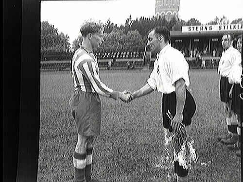 Västerås-ÖSK res. 4-1. Sten Dahl ÖSK:s kapten får blommor för serieseger 1947-1948.